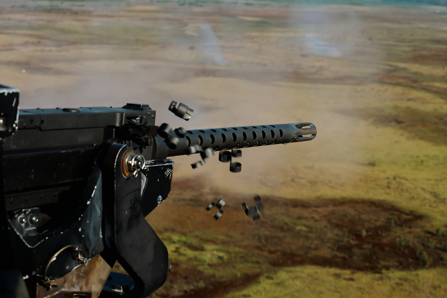 A U.S. Marine fires a GAU-21 machine gun from a UH-1Y Venom helicopter attached to Marine Light Attack Helicopter Squadron (HMLA) 269, Marine Aircraft Group 29, 2nd Marine Aircraft Wing, during close air support training for exercise UNITAS 2025 at Marine Corps Base Camp Lejeune, North Carolina, Sept. 18, 2025. UNITAS, which is Latin for “unity,” was conceived in 1959 and has taken place annually since first conducted in 1960. This year marks the 66th iteration of the world’s longest-running annual multinational maritime exercise. (U.S. Marine Corps photo by Sgt. Jorge Borjas)
