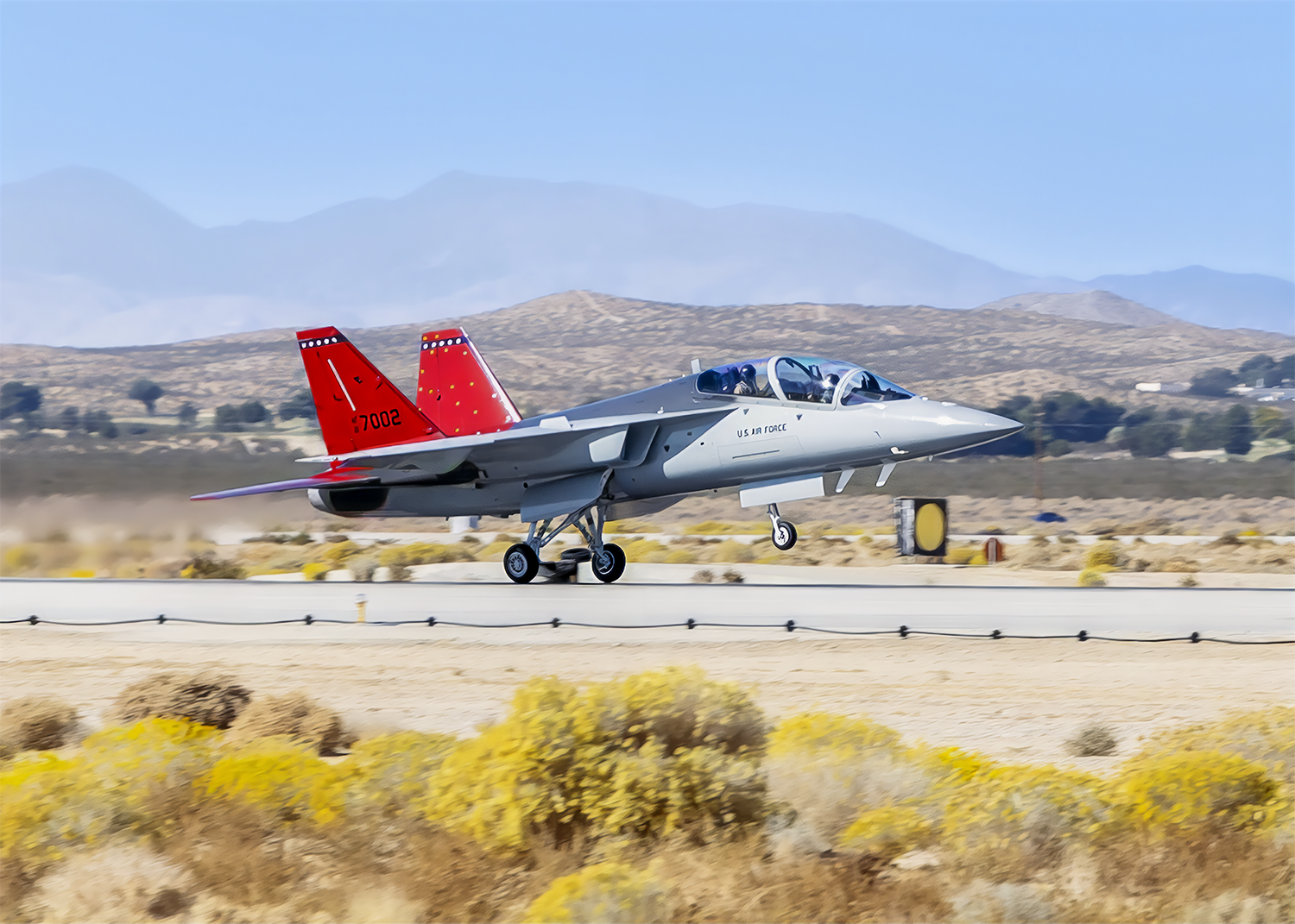 The first T-7A Red Hawk arrives at Edwards Air Force Base, Calif., Nov. 8, 2025. The aircraft’s test campaign is being executed by the T-7A Integrated Test Force, part of the Airpower Foundations Combined Test Force in association with the 416th Flight Test Squadron. The Integrated Test Force is a partnership between the U.S. Air Force and T-7A manufacturer, The Boeing Company. (U.S. Air Force photo by Todd Schannuth)